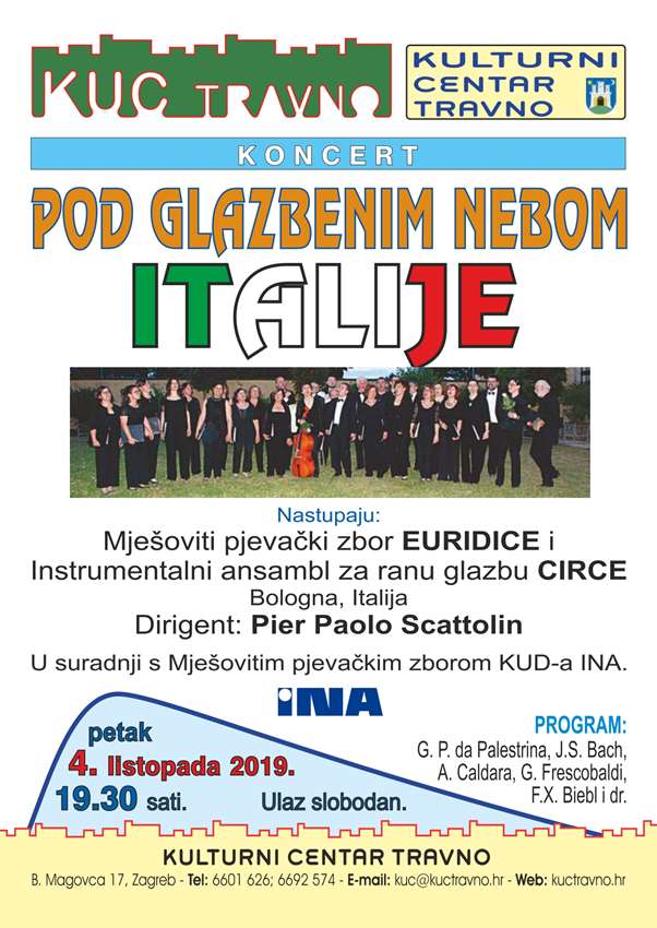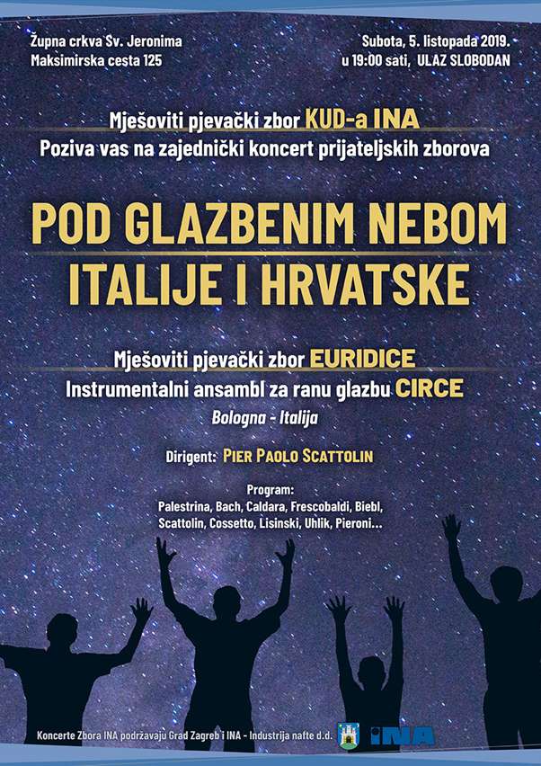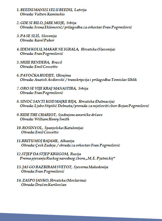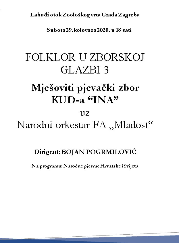 S veseljem Vas pozivamo na koncert koji ćemo izvesti uz Narodni orkestar FA "Mladost". Koncert će se održati u subotu, 29. kolovoza 2020.u 18 sati na Labuđem jezeru Zoološkog vrta Grada Zagreba. Na programu su narodne pjesme Hrvatske, Brazila, Rusije, SAD-a, Sjeverne Makedonije, Latvije, Slovenije, Ukrajine, Španjolske i Srbije.